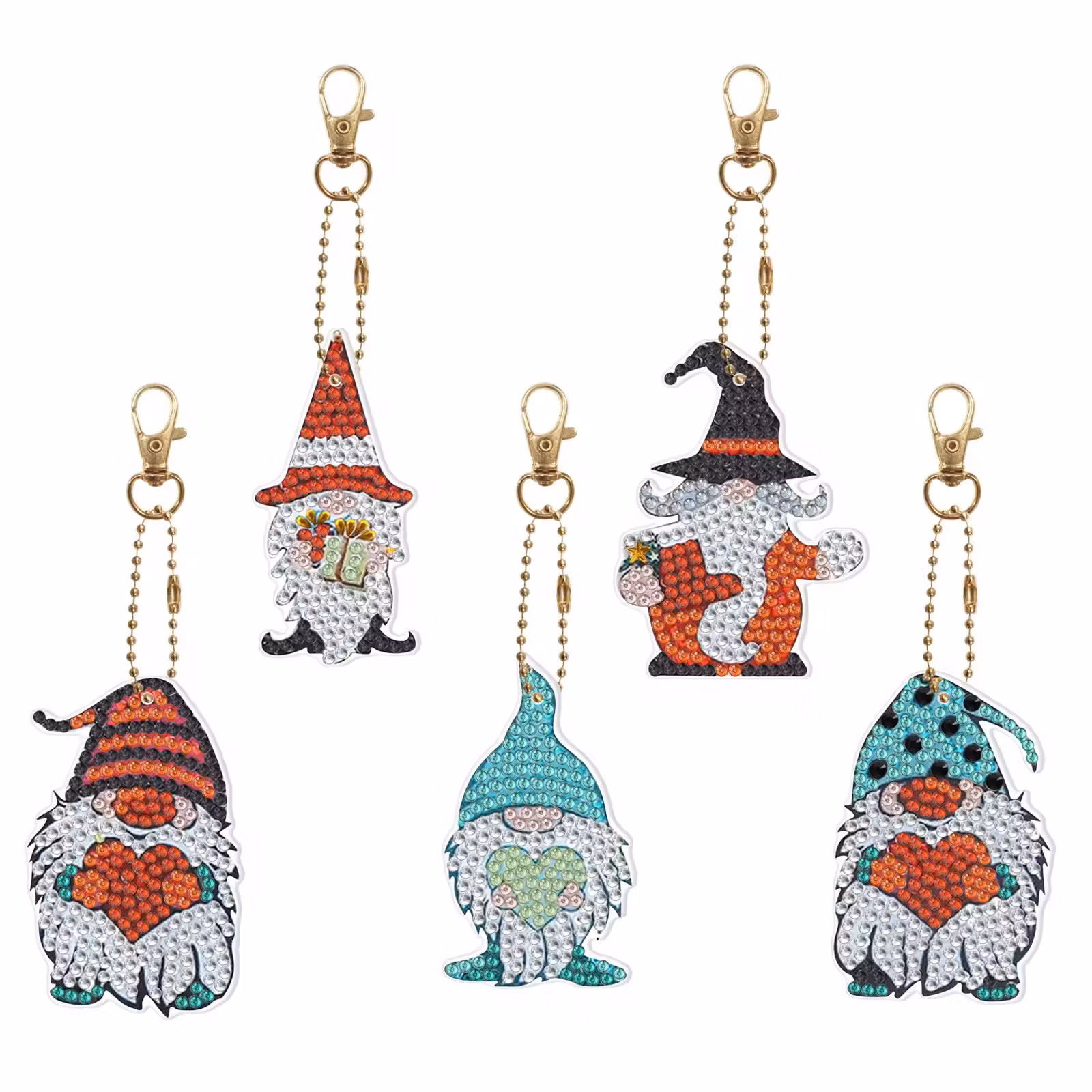 Ett kit med nyckelringar innehåller 5st figurer att pärla på, diamond painting pärlor, verktygskit och vax.