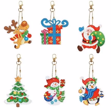 Ett kit med nyckelringar innehåller 6st figurer att pärla på, diamond painting pärlor, verktygskit och vax.