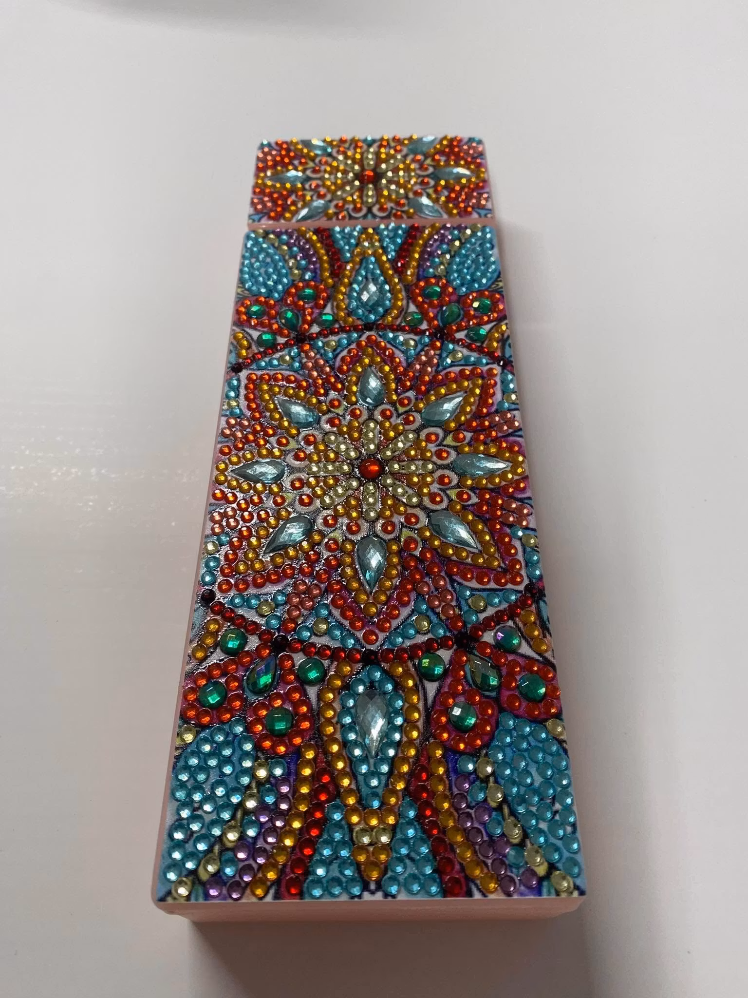 När sista pärlan sitter på plats är skrinet redo att förvara pennor, penslar eller små hemligheter med extra glans.