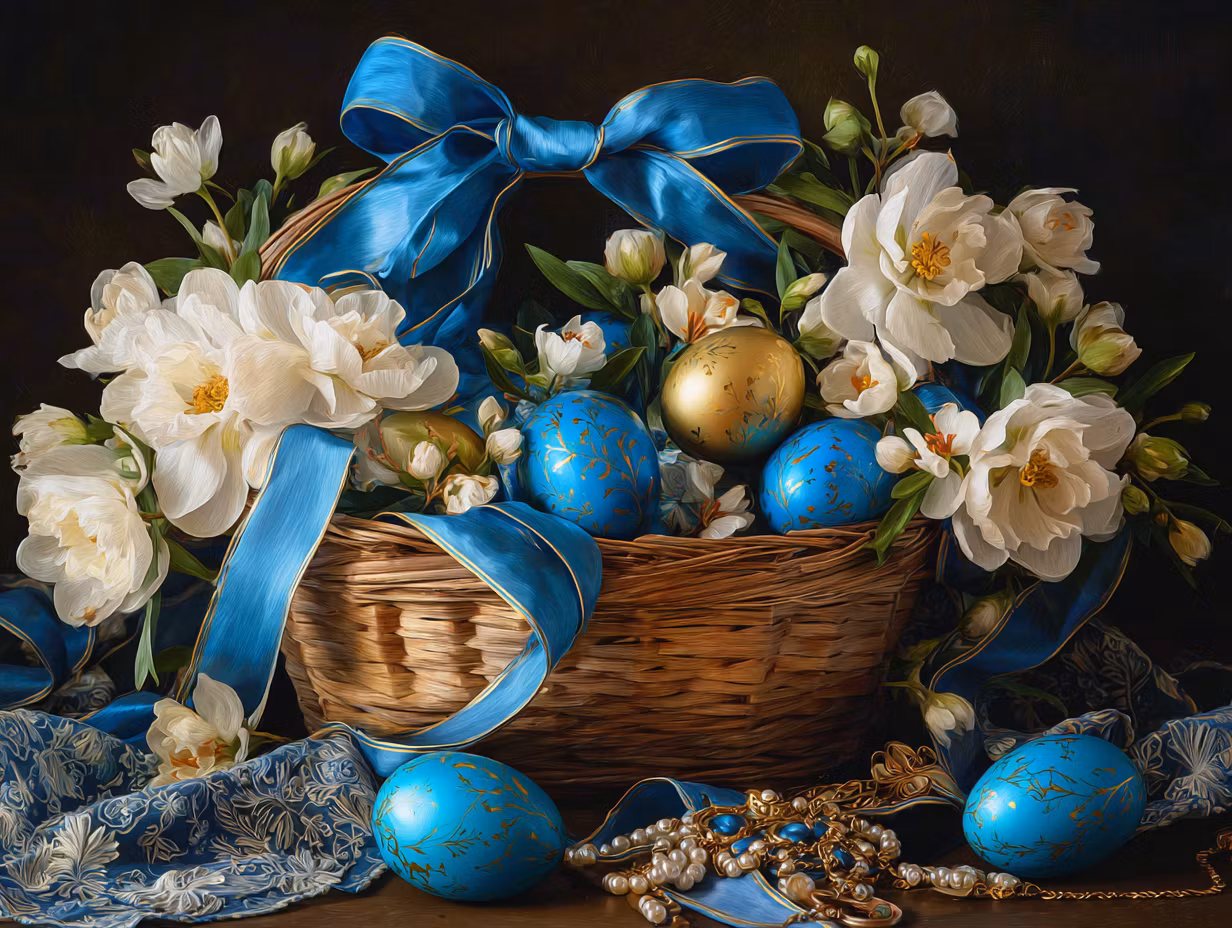 En vacker korg med blÄ och guldfÀrgade Àgg, dekorerade med vita blommor och sidenband.
