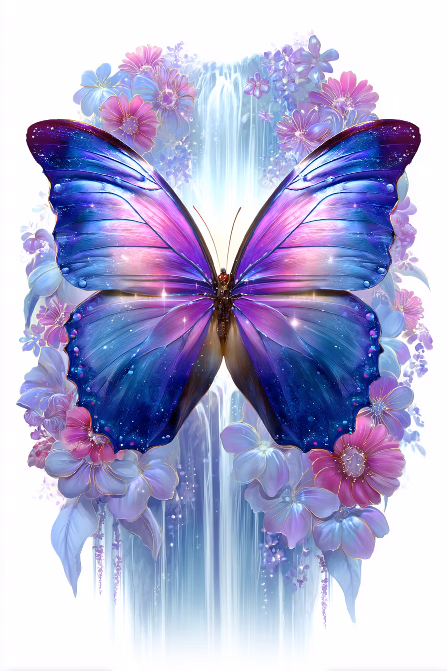 En stor fÀrgsprakande fjÀril framför ett vattenfall och blomsterdetaljer.
