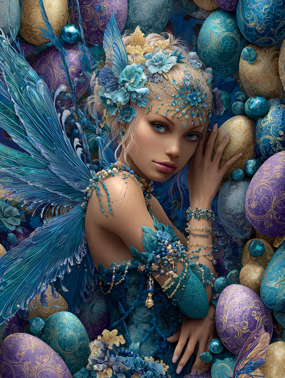 En magisk älva i turkosa toner omgiven av detaljerade, mönstrade påskägg.
