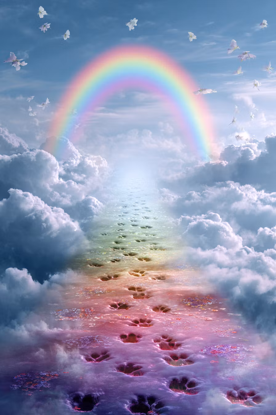 En magisk stig av tassavtryck som leder genom molnen mot en lysande regnbåge