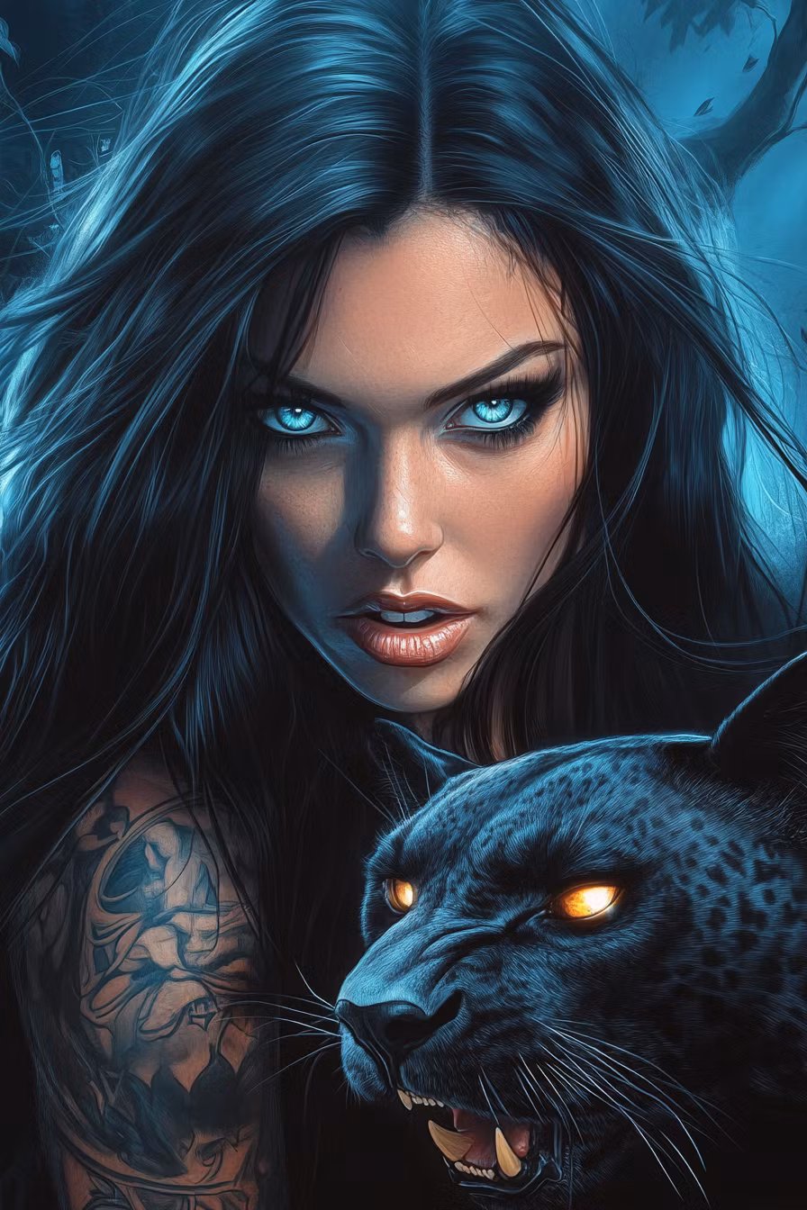 En intensiv kvinna med iskristallblå ögon som står axel mot axel med en rytande svart panter.