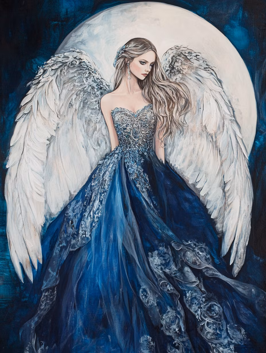 En vacker kvinna med stora vita vingar i en blå klänning, stående framför en strålande fullmåne.