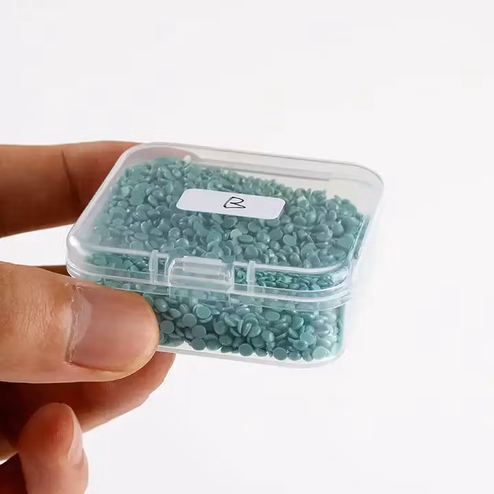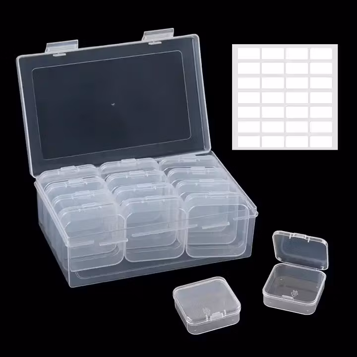 Praktisk låda med lite större burkar för dina överblivna pärlor. Innehåller 12st lite större burkar (Se bild för storlek).
