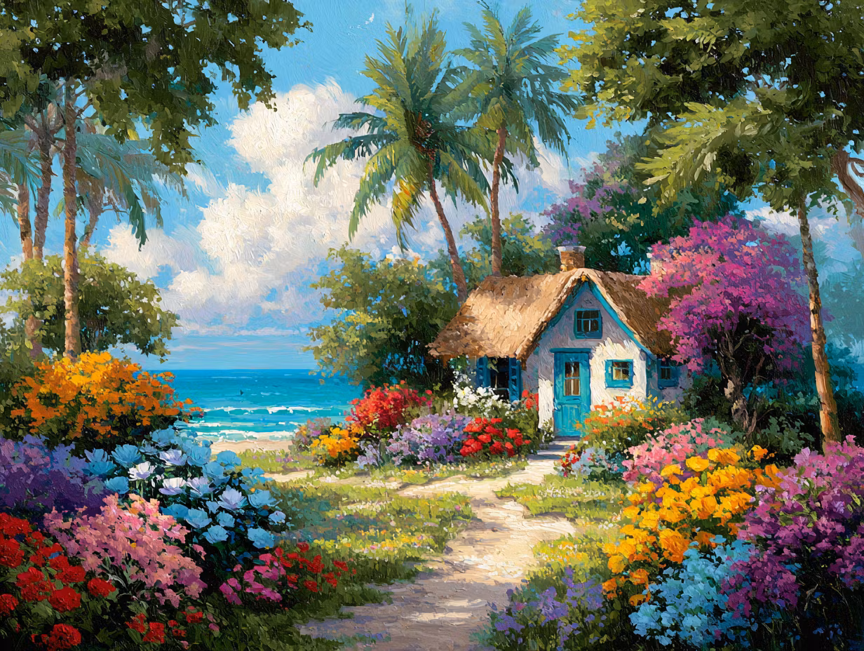 Paint by number - Drömstuga i tropiskt blomsterhav (Beställningsvara)
