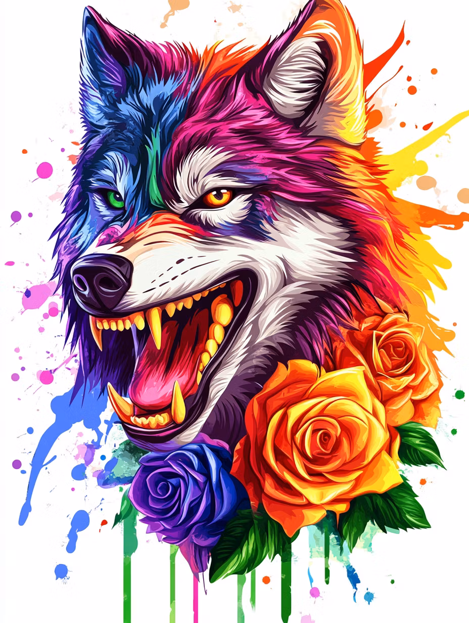 Paint by number - Färgsprakande varg med rosor (Beställningsvara)