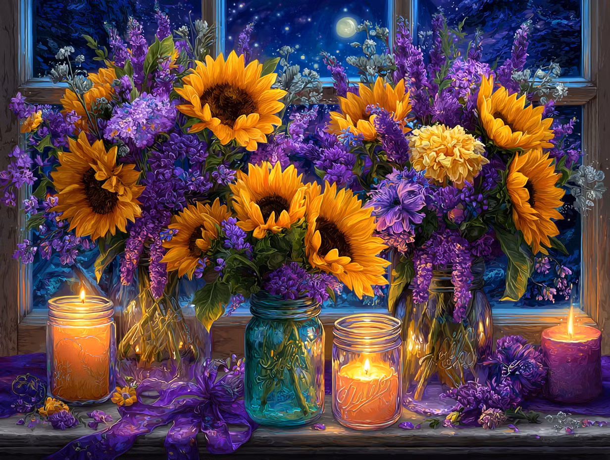 Paint by number - Nattens magi bland solrosor och levande ljus (Beställningsvara)
