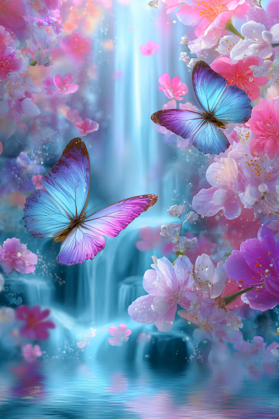 TvÄ eleganta fjÀrilar som svÀvar bland rosa blommor framför ett mjukt rinnande vattenfall.
