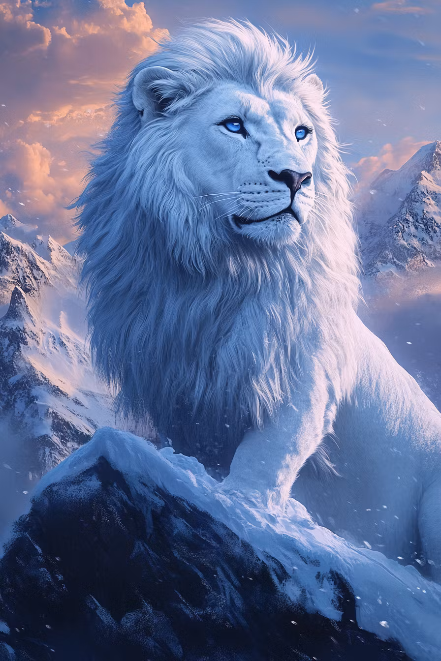 En majestÀtisk vit lejonhane med isblÄ blick stÄr stolt pÄ en snötÀckt klippa med mÀktiga berg i bakgrunden.
