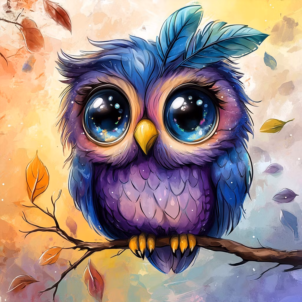 En storögd uggla i lila och blå toner som sitter stilla på en gren med löv som sakta faller omkring.