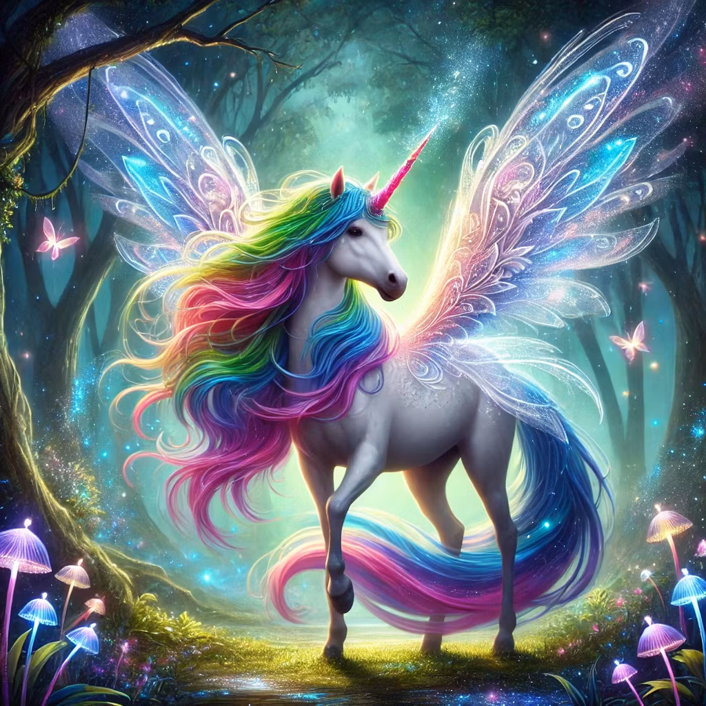 En regnbÄgsfÀrgad enhörning med gnistrande vingar som stÄr i en förtrollande skog. Lysande svampar och fjÀrilar.