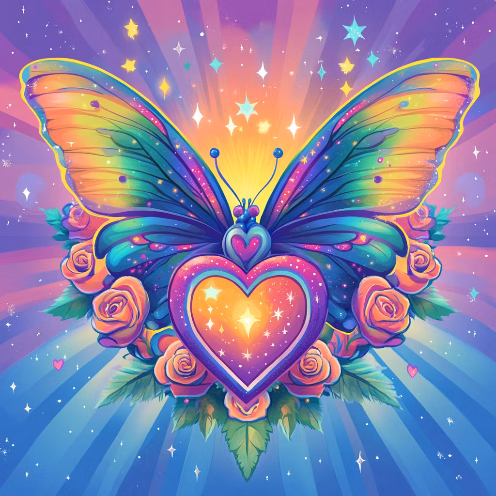 En färgsprakande fjäril med ett hjärta i mitten, inramad av rosor och stjärnor.