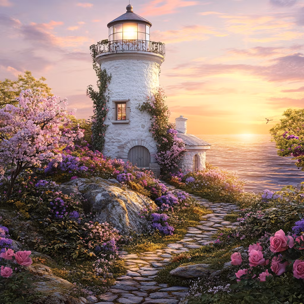 Ett romantiskt vitt fyrtorn som Àr omgivet utav en blomstrande trÀdgÄrd och havets sken frÄn solnedgÄngen.