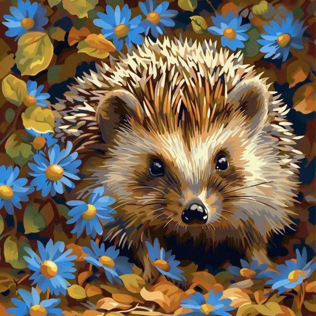 Diamond painting motiv: Närbild utav en bedårande igelkott som kikar fram bland blåa prästkragar och höstlöv.