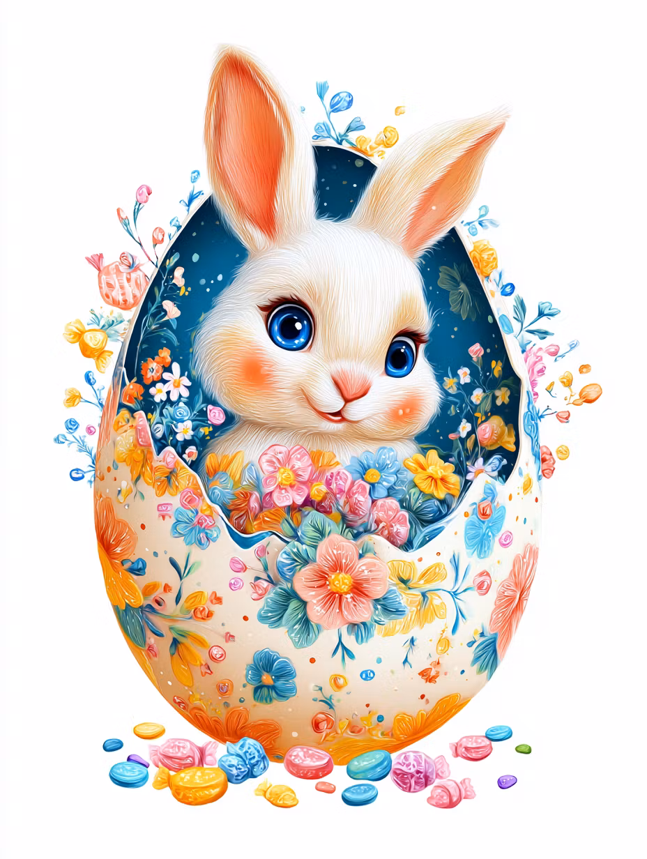 En söt liten kanin som tittar fram ur ett dekorerat påskägg, fyllt med färgglada blommor och godis.