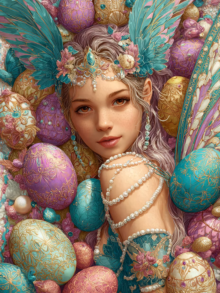 En vacker älva som är omgiven av detaljerade och dekorativa påskägg i guld och pastell.