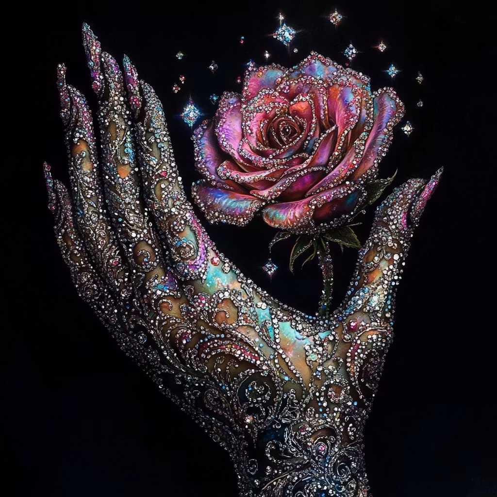 Diamond painting motiv: En dekorativ hand, utsmyckad med gnistrande stenar, håller i en skimrande ros.