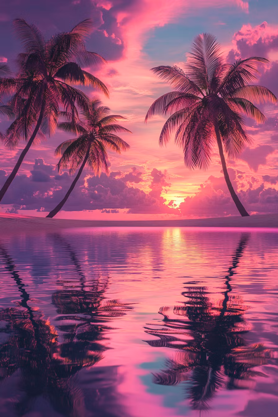 Silhuetter av palmer mot en glödande rosa och lila solnedgång som speglar sig i ett stilla vatten.