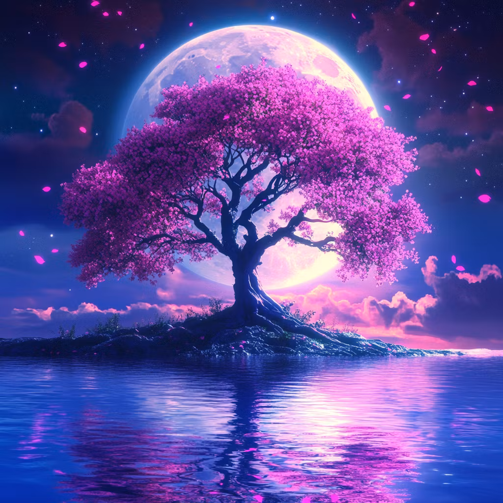 Helt träd vid vattnet framför fullmåne