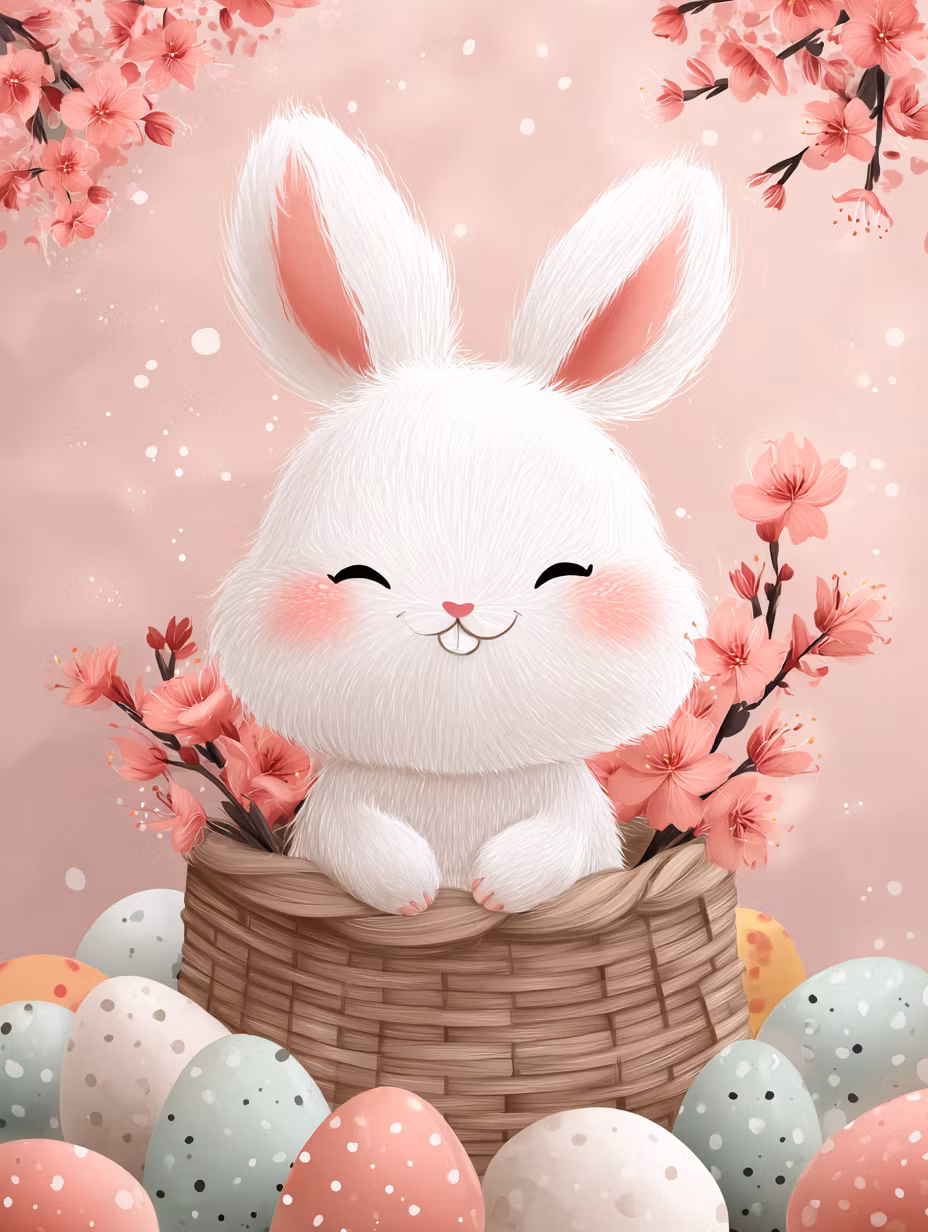 En gullig vit kanin som sitter i en korg, omgiven av rosa blommor och pastellfÀrgade pÄskÀgg.