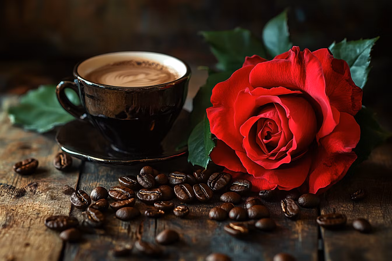 En varm och romantisk scen med en svart kaffekopp, röd ros och kaffebönor på ett rustikt träbord.