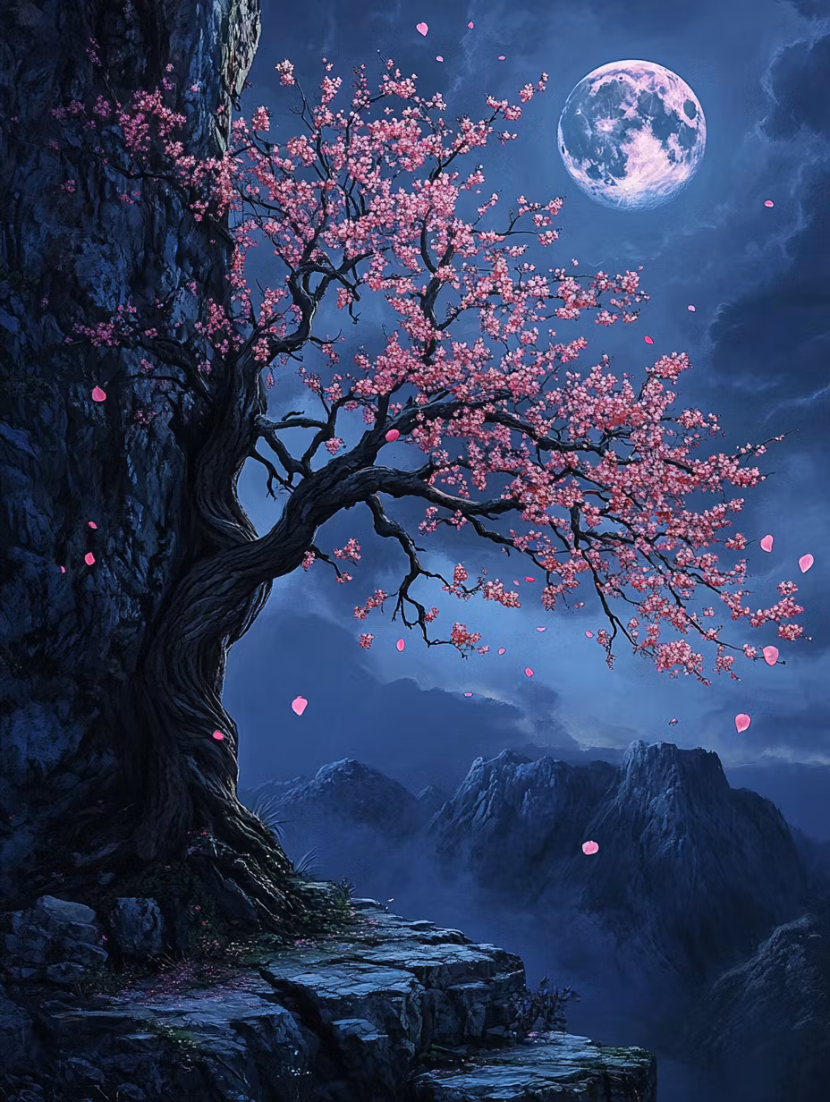 Ett knotigt körsbärsträd klamrar sig fast vid en klippbrant, i full blom mot en dramatisk natthimmel med en fullmåne.