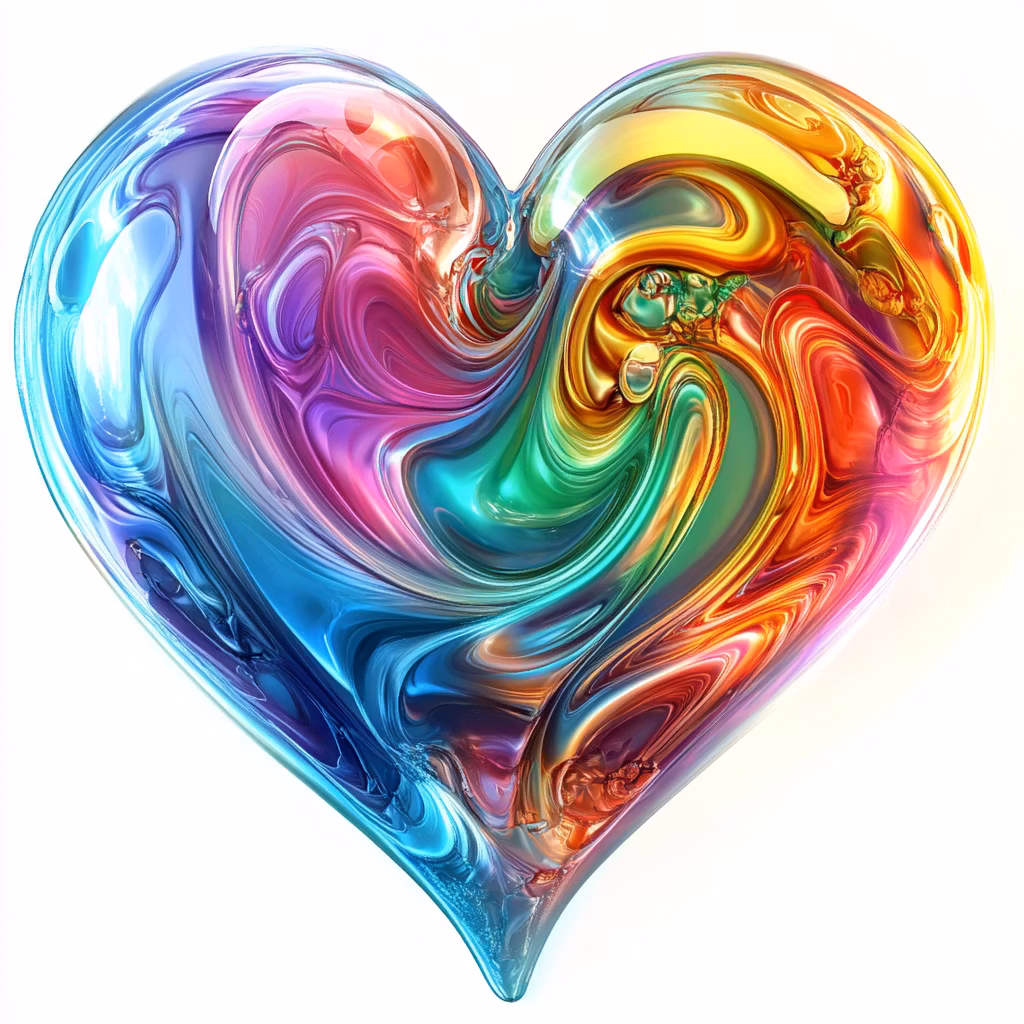 Ett glasskulturlikt hjärta på vit bakgrund som är fyllt av klara, flytande regnbågsvirvlar som reflekterar ljuset i skimrande vågor.