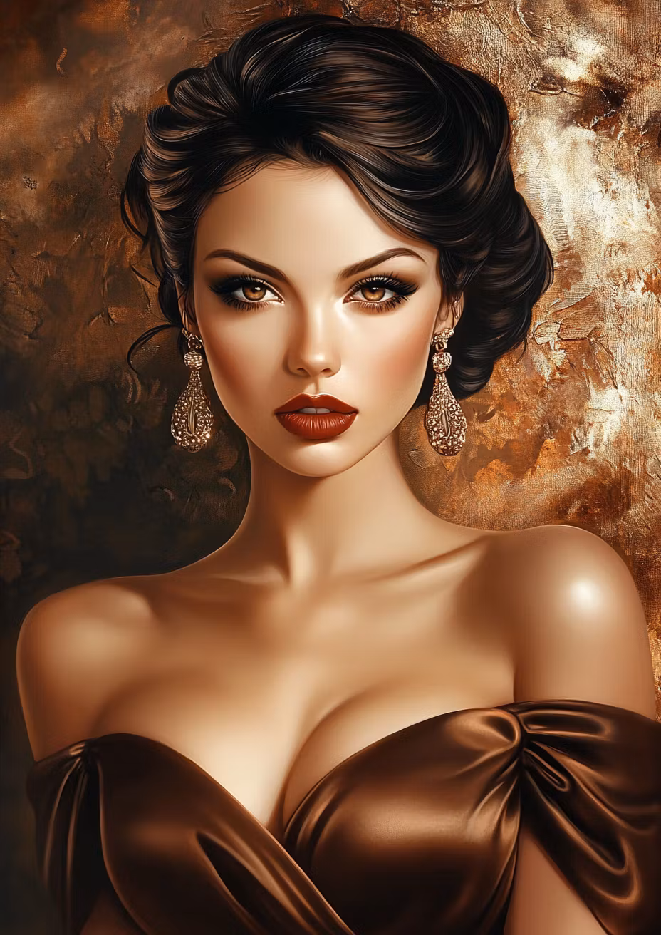 Ett konstnärligt porträtt av en kvinna med bronsfärgad klänning och glittrande örhänge mot en bakgrund av varma toner.
