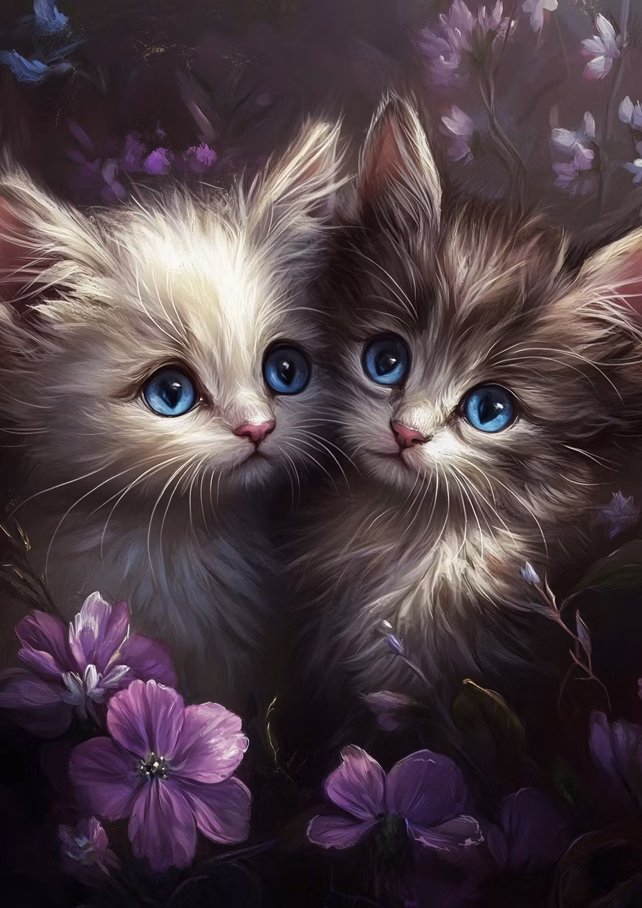 Två söta kattungar med blå ögon som vilar bland mörklila blommor i ett drömlikt nattlandskap.