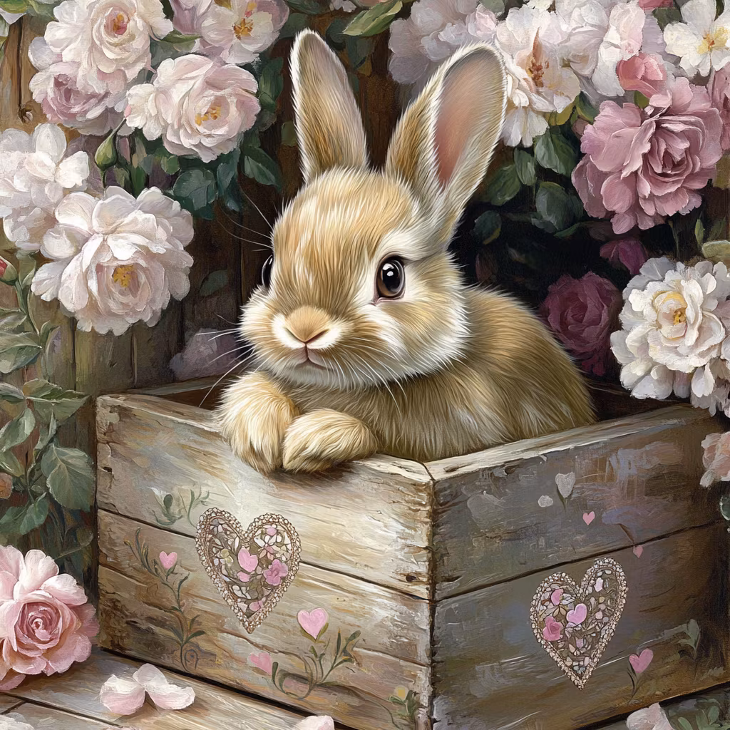 En charmig kanin som sitter i en rustik trälåda som är dekorerad med hjärtan, omgiven av ljusa rosor och blomster.