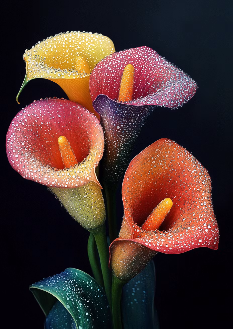 Fyra kallablommor i regnbÄgskiftande nyanser.
