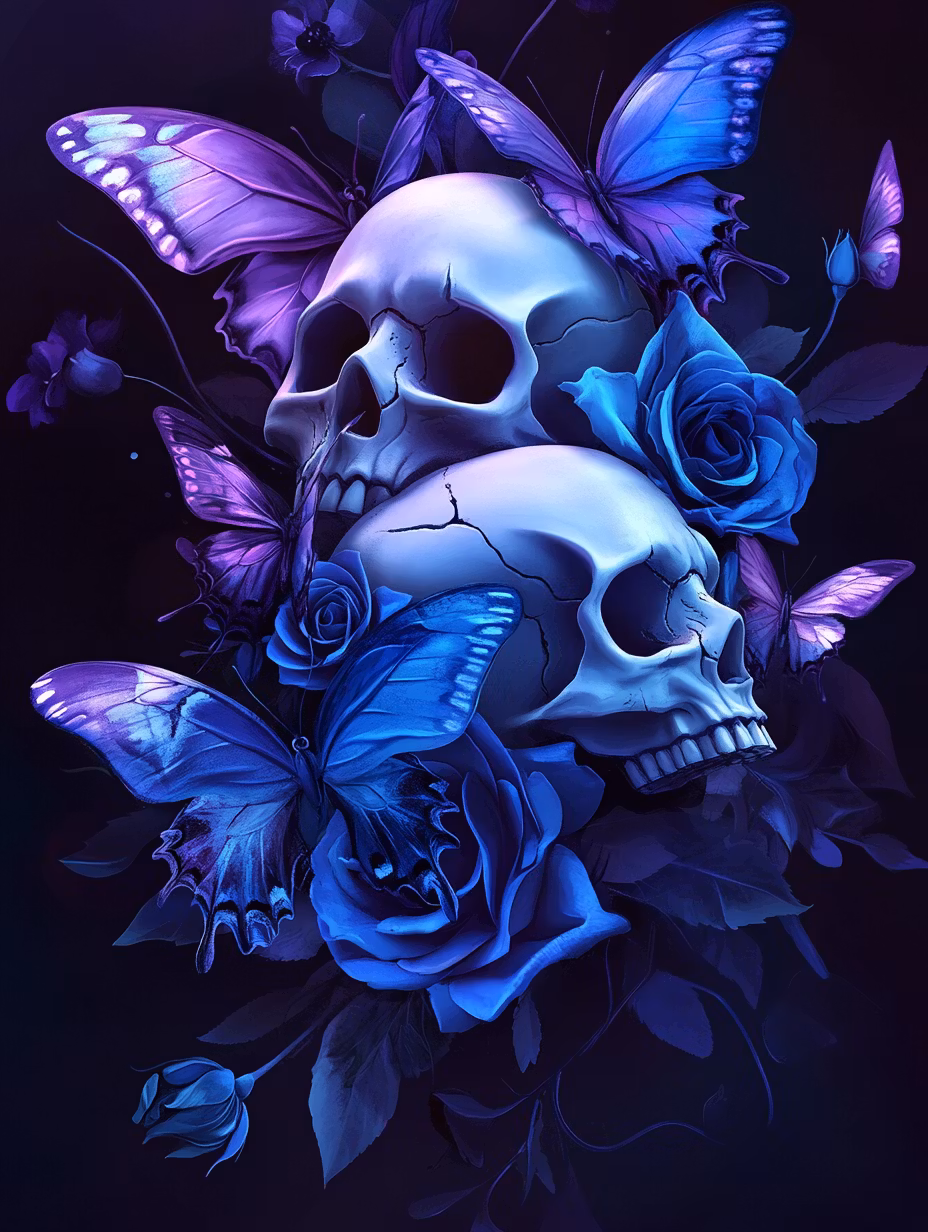 Två döskallar som ramas in utav lysande blå fjärilar och rosor.