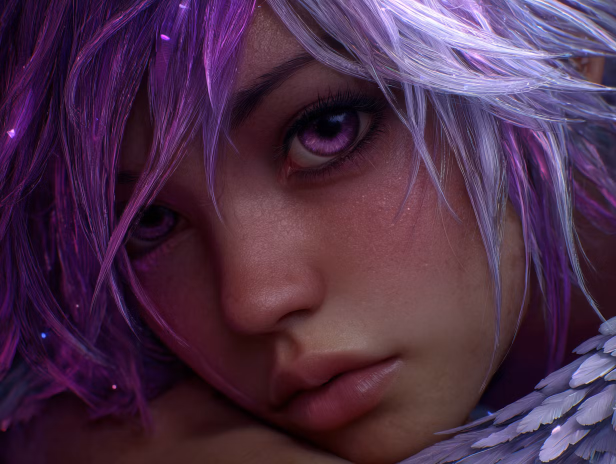 NÀrbild pÄ kvinna med lila hÄr och lila ögon