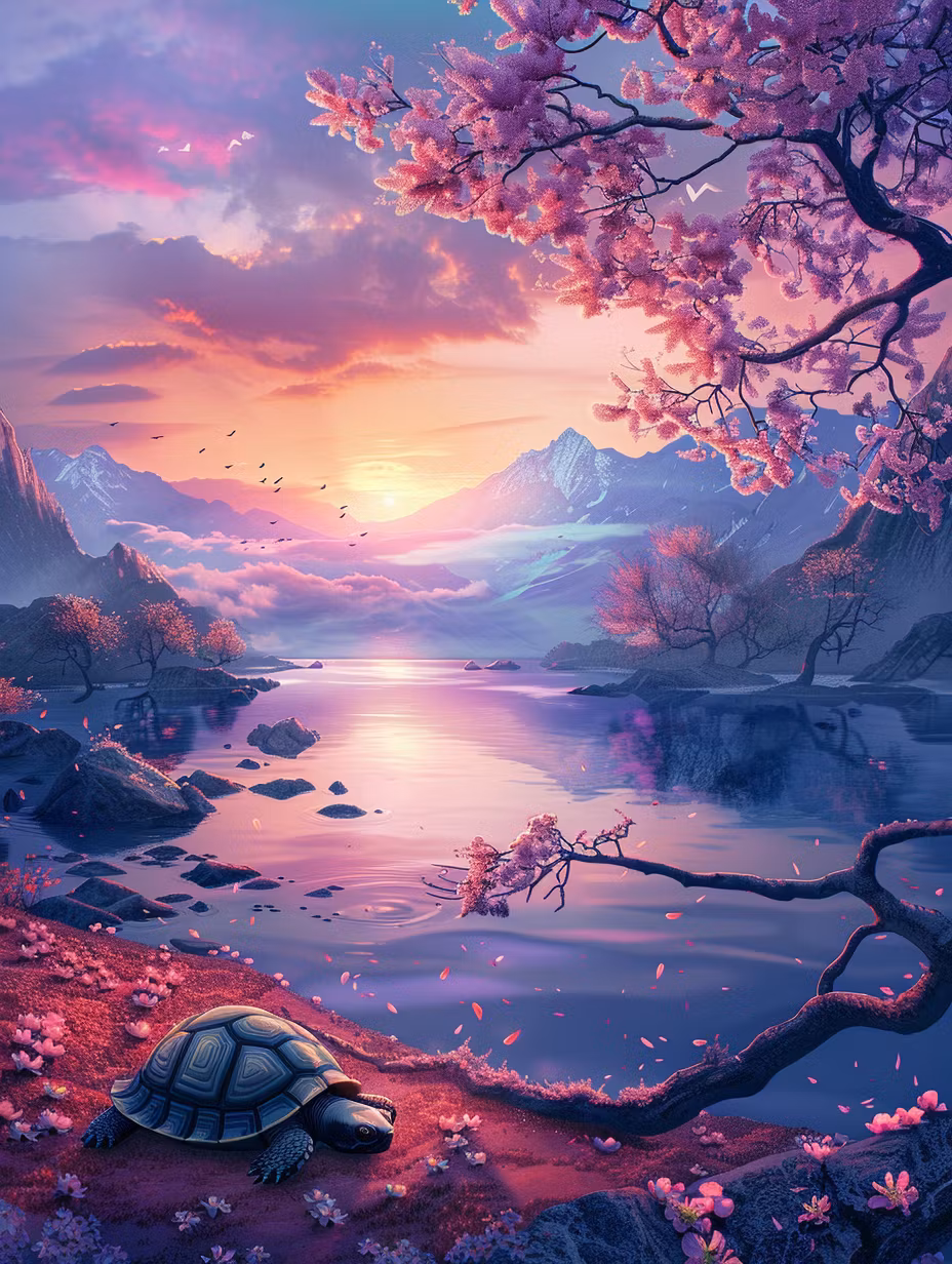 En sköldpadda som ligger och vilar vid en spegelblank sjö.