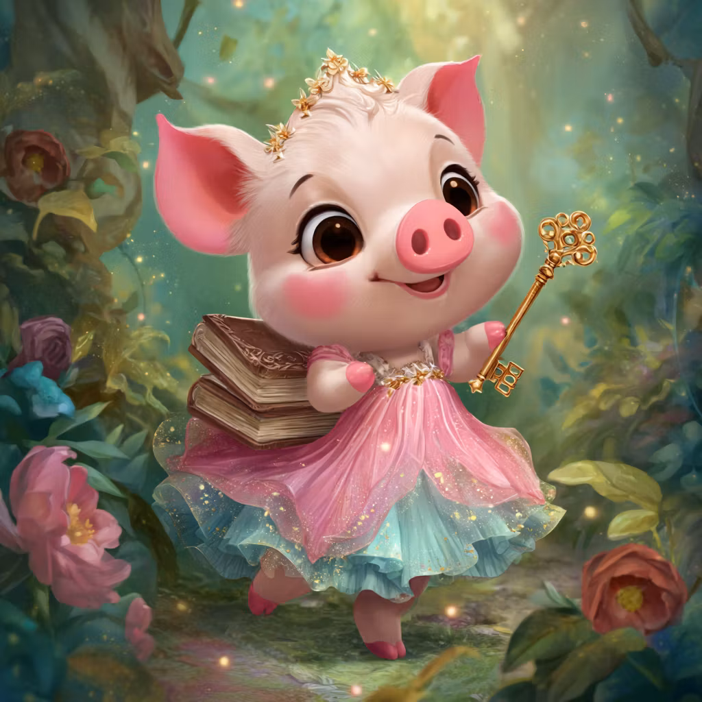 Söt gris i klÀnning med gyllene nyckel och böcker