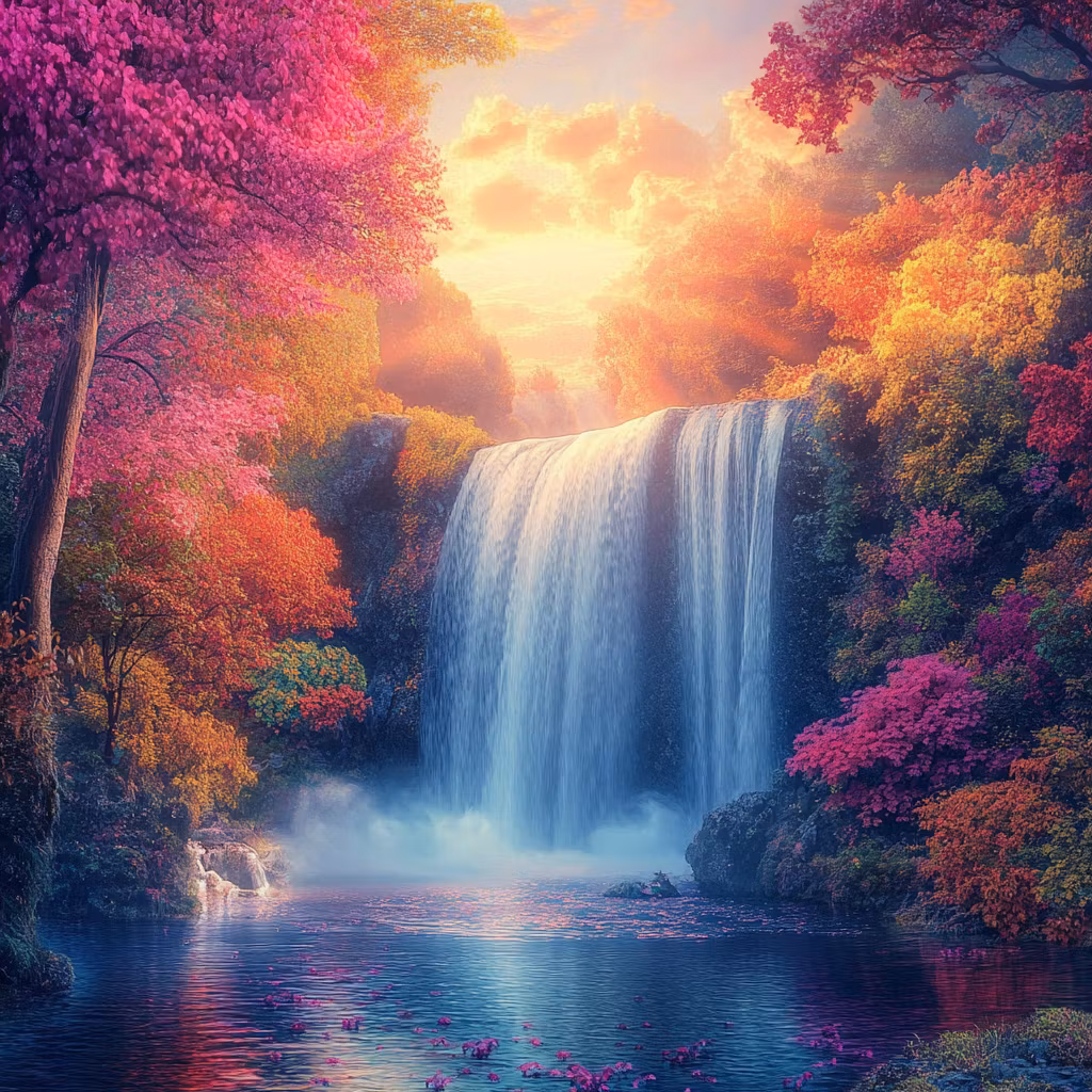 MÀktigt vattenfall omgivet av fÀrgsprakande natur