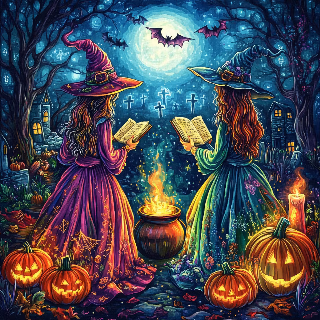 TvÄ hÀxor med böcker runt eld och pumpor i natten