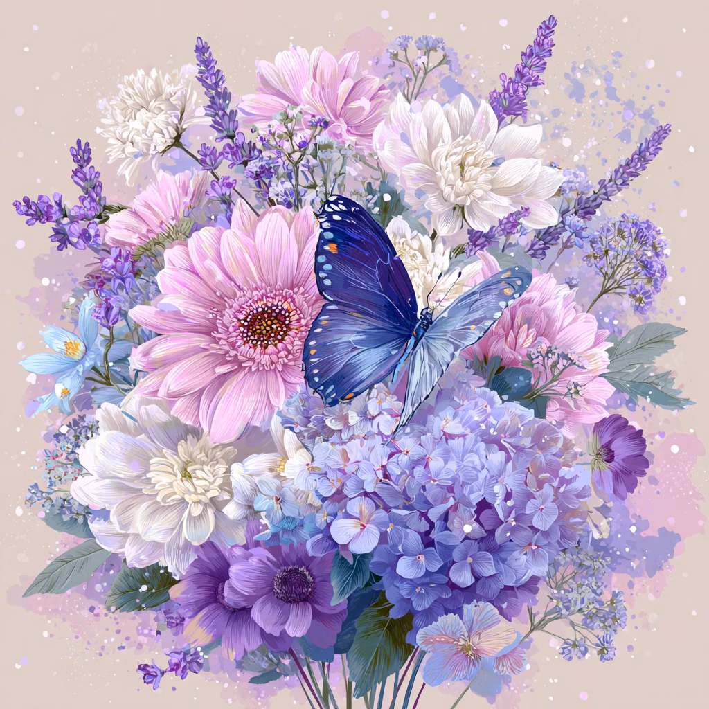 Korsstygnsmönster: Bukett med blommor och fjäril