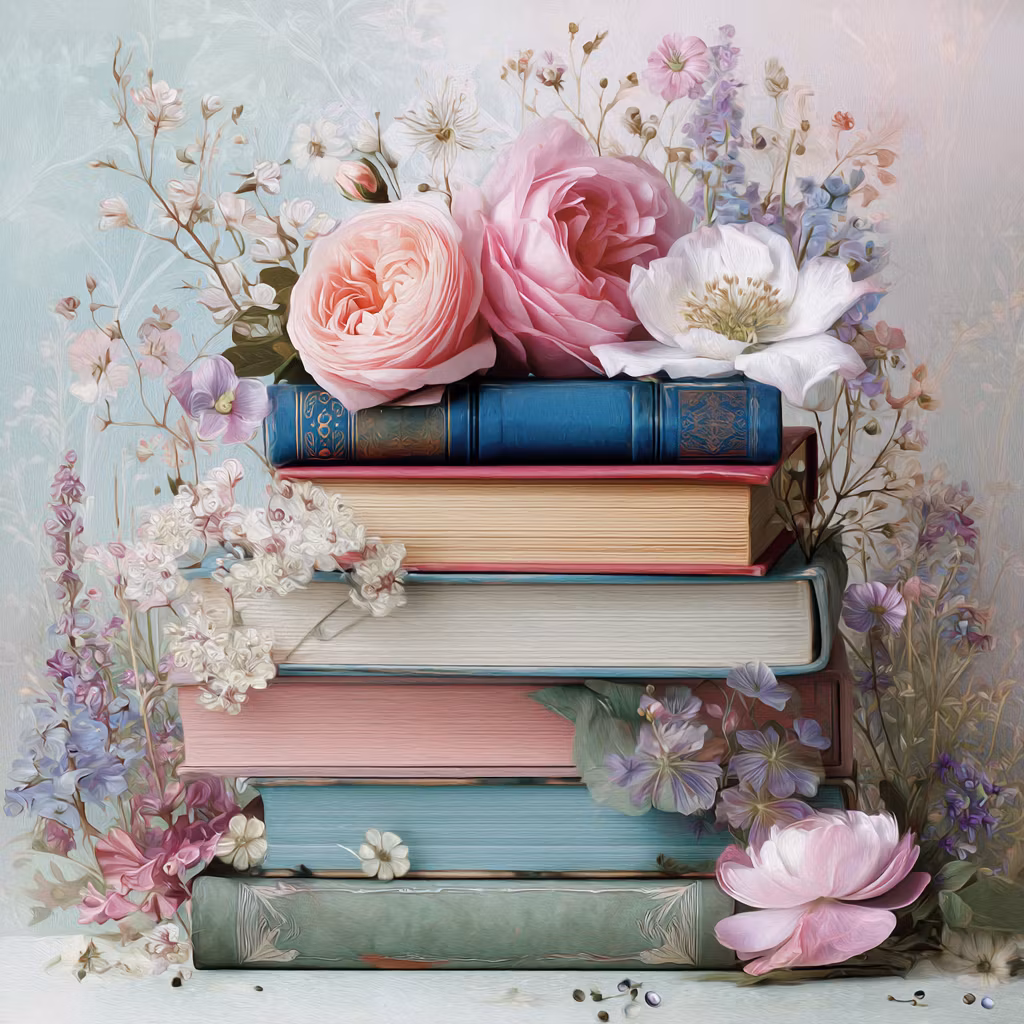 Korsstygnsmönster: En hög med böcker bland blommor