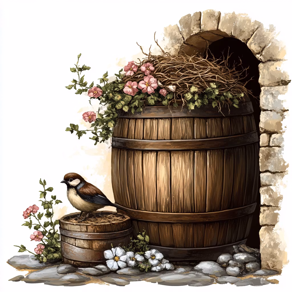 Korsstygnsmönster: Ett stillsamt och lantligt motiv där en liten fågel vilar vid en gammal trätunna fylld med blommor och kvistar.