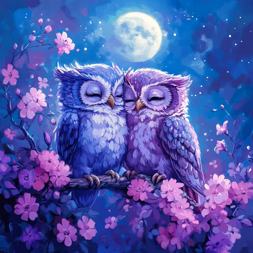 Korsstygnsmönster: Två ugglor sitter tätt tillsammans under månskenet, omgivna av blommande grenar.