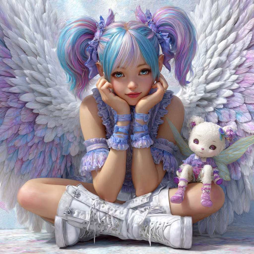 Korsstygnsmönster: Ett magiskt och fantasifullt motiv med ett änglalikt barn med stora fjädervingar i pastelltoner.