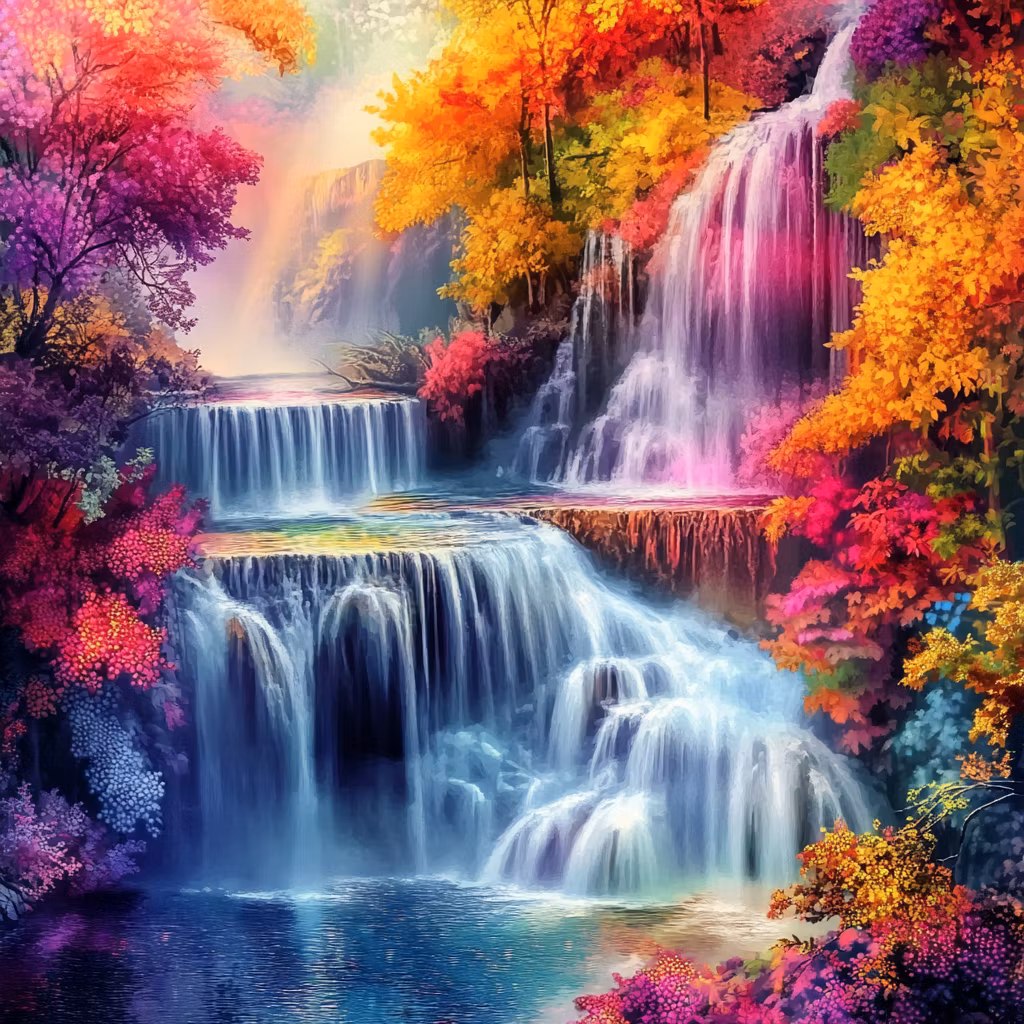 Korsstygnsmönster: Ett färgsprakande naturmotiv där ett mäktigt vattenfall rinner genom en skog i explosion av höstens alla färger.
