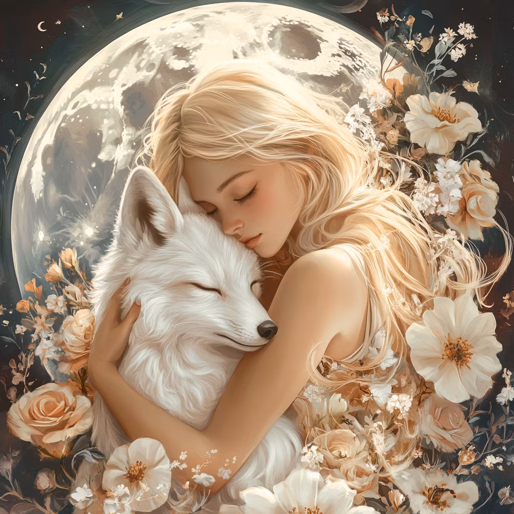Korsstygnsmönster: Flicka och vit varg som kramas bland blommor