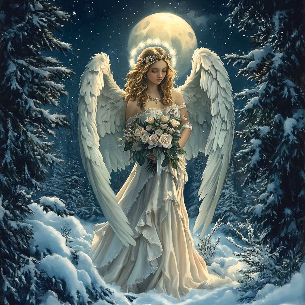 Korsstygnsmönster: Vacker ängel i snöigt landskap
